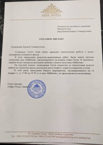 В одностороннем порядке ОсОО” Парк Отелем было предоставлено письмо без даты и подписи с отказом. Адвокат “Дома Правовой Интервенции” в досудебной претензии пояснил: